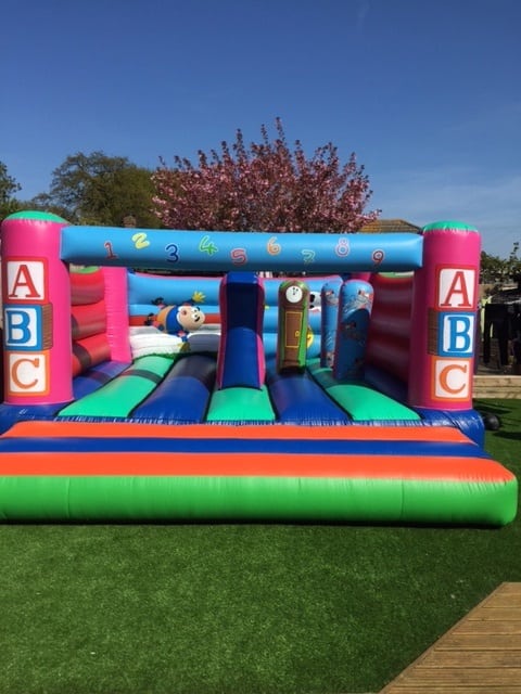 This castle has pictures of nursery rhyme characters all over and on the front there are numbers and ABC blocks.