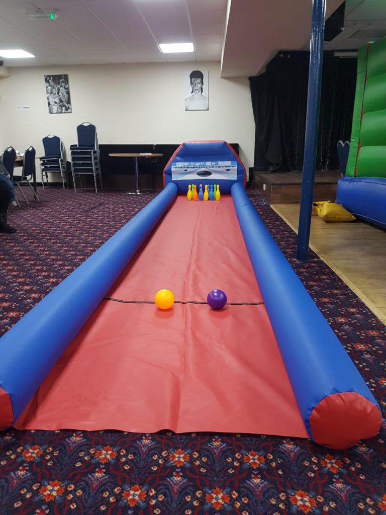 You will receive ten pins and 2 bowling balls and the measurements are 22ft long and 5ft wide