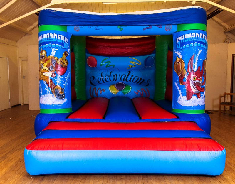 This Skylander bouncy castle is popular with boys and has a picture on each side of Trigger Happy and Spyro.