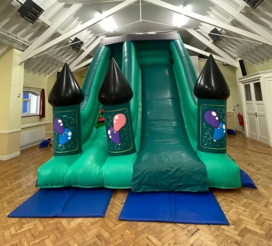 12ft x 15ft wide by 17ft high. (10ft to platform).What makes this slide great, is you don't have to have a massive garden to fit it in. This amazing slide is green and decorated on the 3 turretts at the front. Fantastic slide for either boys or girls, suitable for teenagers too. Your children will have hours of constant fun running up and sliding down. Comes complete with pegs, blower and mats.