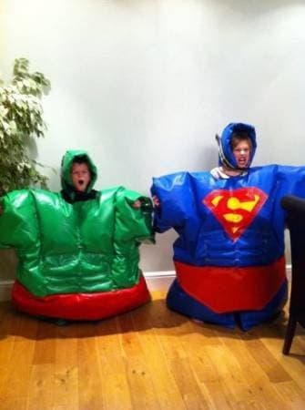 2 Adult Superhero Sumo Suits. Comes complete with Helmet, suit and Mat. Ideal for Teenagers upwards.