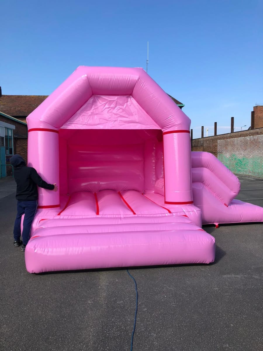 This velcro castle with slide is fully plain baby pink, can have music and lights inside the castles + over 50+ changeable themes to match the party